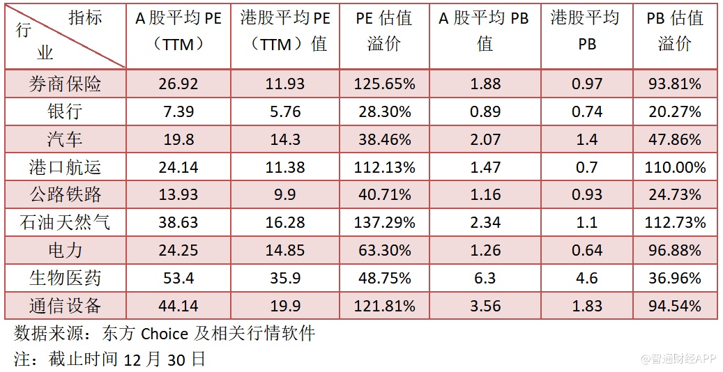 智通财经APP整理了AH股在8个行业的PE(TTM)和PB估值,并进行了对比,PE(TTM)估值溢价超过100%的有4个行业,分别为券商保险、港口航运、石油天然气以及通信设备,PB估值溢价超过100%的有两个,分别是港口航运和石油天然气,不过券商保险、电力以及通信设备溢价均超过90%。