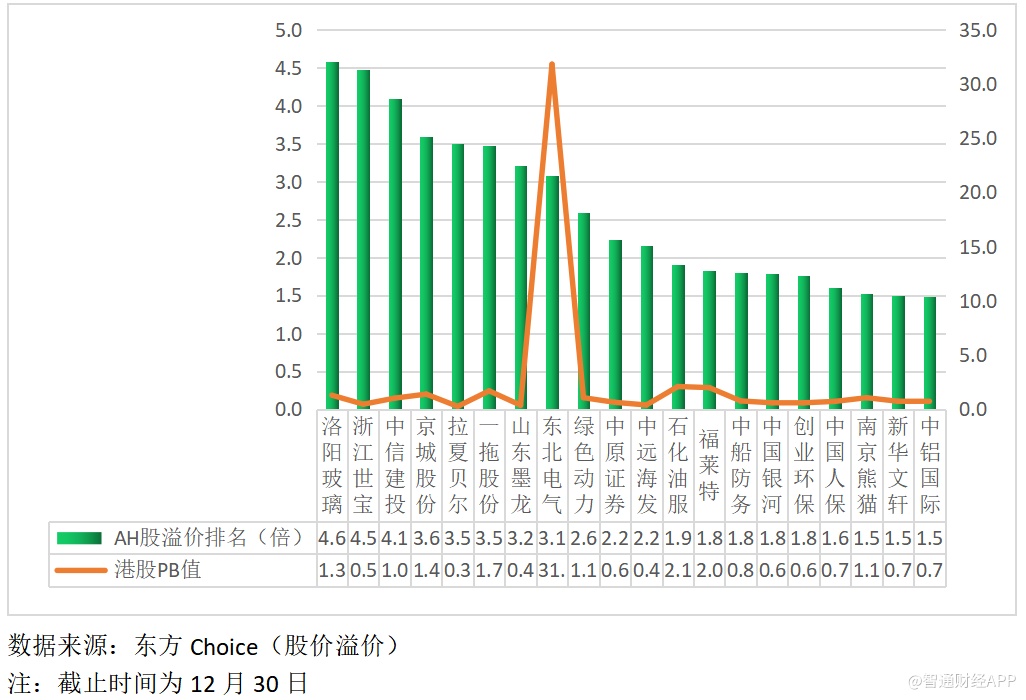智通财经APP了解到,根据东方Choice的统计,港A股市场共有119只AH股(即既在A股上市也在港股上市)。截止12月30日,全部都产生了溢价,A股平均股价为14.44元/每股,港股平均股价为9.58元/每股,平均股价溢价达50.7%,其中中国平安(02318)溢价最低,为3.52%,洛阳玻璃(01108)溢价最高,为458.4%。