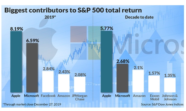 这两家公司不仅占据主导地位,标准普尔道琼斯指数资深指数分析师西尔弗布拉特(Howard Silverblatt)编制的数据显示,过去10年里,他们实际上加强了对标普500指数的总回报率,从过去10年里占该指数总回报率的8.45%,上升到截至12月27日的过去12个月里的14.8%。