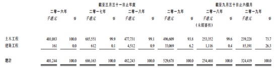 于往绩记录期间,公司合共承接28个土木工程项目及3个建筑工程项目,所有该等项目均为公司贡献收益。在该等31个项目中,10个乃于往绩记录期间之前进行,及6个、1个、3个、9个及2个项目分别于截至2016年-2019年3月31日止年度以及截至2019年9月30日止六个月授予公司。