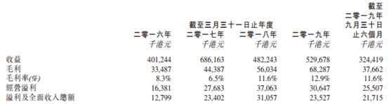 截止2016年-2019年3月31日止年度,公司的收益分别为4.01亿港元、6.86亿港元、4.82亿港元和5.30亿港元;毛利约为3349万港元、4439万港元、5603万港元及6829万港元;净利润约为1280万港元、2340万港元、3106万港元及2353万港元。