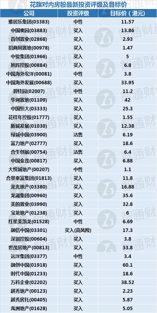 智通财经APP获悉,花旗发布报告,对内房股最新的投资评级和目标价如下表: