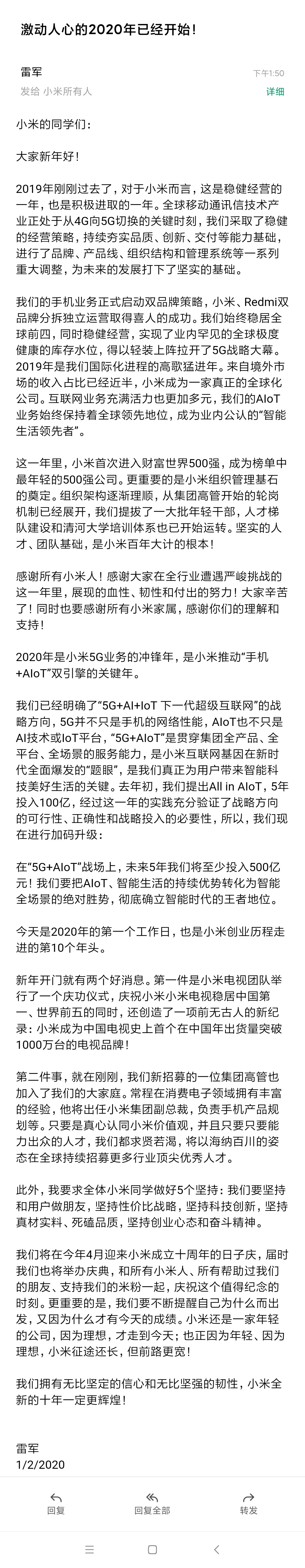 1月2日,小米创业历程走进第十年。小米集团(01810)董事长、CEO雷军,向全体小米员工发布新年全员信,提出三大重大消息。