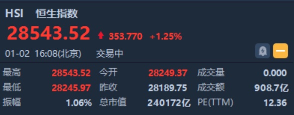 智通财经APP获悉,恒指早盘高开59.62点或0.21%,报28249.37点。截至收盘,恒生指数涨353.77点或1.25%,报28543.52点,全日成交额达908.75亿。国企指数涨1.37%,报11320.56点,红筹指数涨0.91%,报4579点。