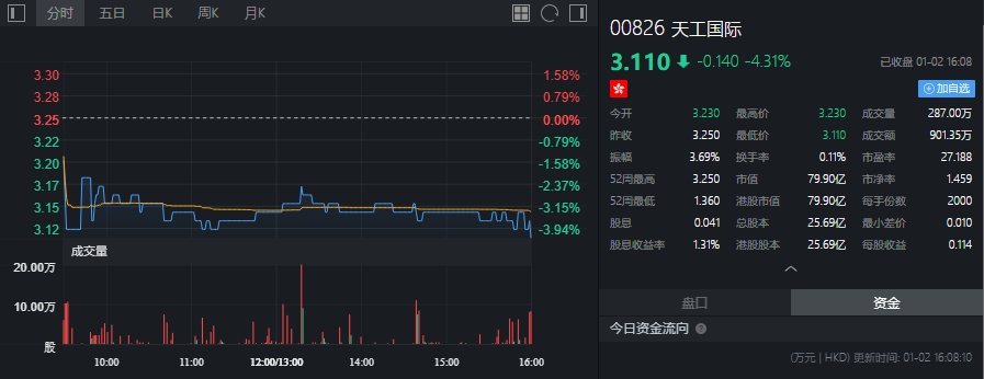 截至今日收盘,天工股份跌4.31%,报3.11港元。