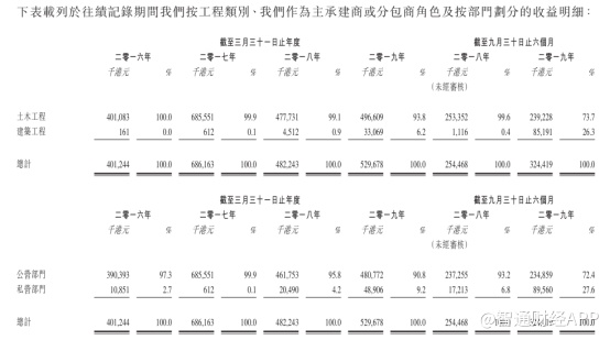 按照业务划分,公司主要收入来自土木工程,其次为建筑工程。截至2019年9月30日止6个月,公司土木工程实现收入2.39亿港元,占比73.2%,建筑工程业务收入0.85亿港元,占比26.3%;按收入来源划分,公司主要收入来自供应部门,其次为私营部门,截至2019年9月30日止6个月,公司来自供应部门收入达到2.35亿港元,占比72.4%,来自私营部门收入0.9亿港元,占比27.6%。