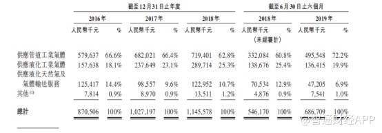 其中管道工业气体的供应产生的收益分别占截至2016年至2018年12月31日止年度及截至2019年6月30日止六个月的总收益约66.6%、66.4%、62.8%及72.2%。于往绩记录期内,公司所有的管道工业气体供应收益均来自对河钢成员集团的成员公司的销售。