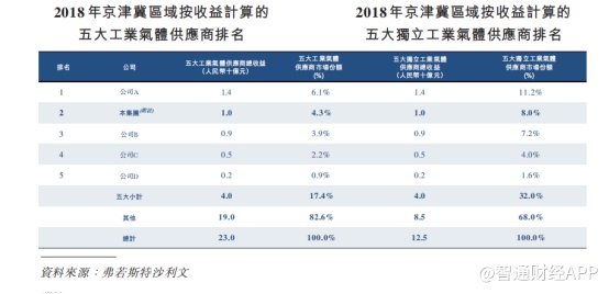 根据弗若斯特沙利文的资料,京津冀区域工业气体行业有大约 50到100家独立的工业气体供应商。2018年公司收益约为人民币10亿元,占 2018年京津冀区域工业气体供应商总收入的4.3%。在京津冀区域排名第二,在河北省排名第一。