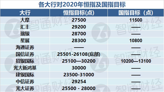 汇丰和瑞银分别给予2020年恒指目标在29200点和28700点。