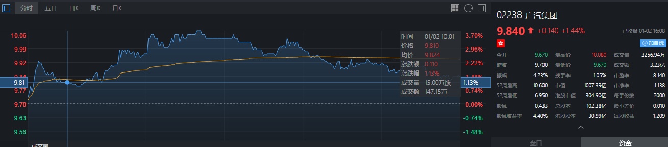截止至1月2日收盘,广汽集团涨1.44%,每股报价9.84港元。
