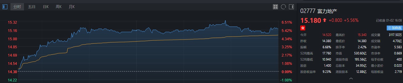 截止至1月2日收盘,广州富力涨5.56%,每股报价15.18港元。