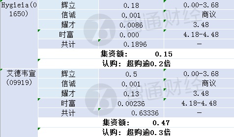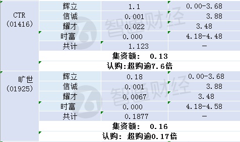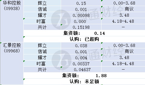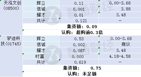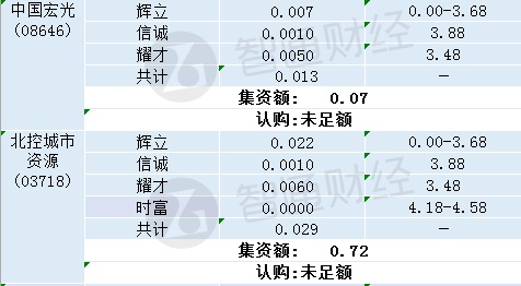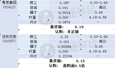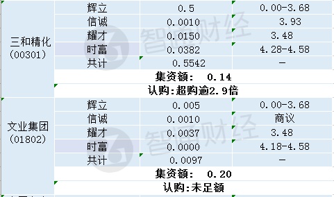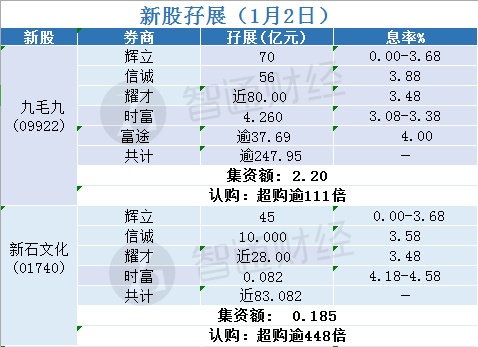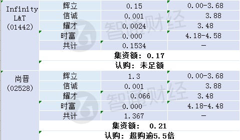 其中九毛九超购逾111倍,新石文化超购逾448倍,三和精化超购逾2.9倍,尚晋超购逾5.5倍,,CTR超购逾7.6倍,旷世超购逾0.17倍,天泓文创超购逾0.3倍,GHW超购逾0.2倍,佳辰控股超购逾0.5倍,华和控股已超购,Hygieia购逾0.2倍,艾德韦宣超购逾0.3倍。其余八家未足额。