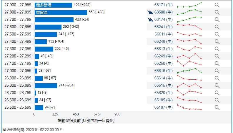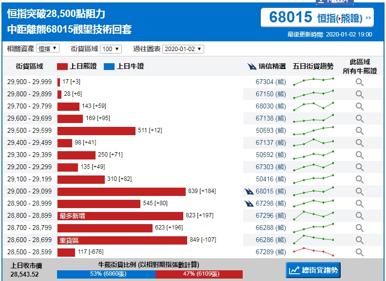 智通财经APP获悉,截至1月2日,恒指最新的牛熊街货比例53:47。瑞信恒指牛熊证街货分布图中的数据显示,熊证街货重货区在28600-28699区间,该区间最新熊证数量为849张,较上一交易日减少107张,最多新增在28800-28899区间,该区间最新熊证数量为823张,较上一交易日增加197张。牛证街货重货区在27800-27899区间,该区间最新牛证数量为568张,较上一交易日减少488张,最多新增在27900-27999区间,该区间最新牛证数量为406张,较上一交易日增加292张。
