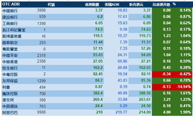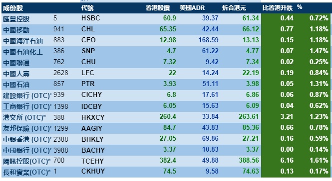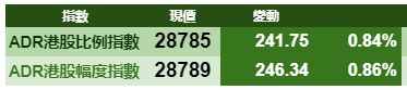 智通财经APP获悉,1月2日,美股再创新高,刺激港股ADR指数全日造好,按比例计算,收报28785点,升241.75点或0.84%。大型蓝筹全线上升,汇丰控股收报61.34元,较港收市升0.44元;腾讯控股收报388.56元,较港收市升6.16元。