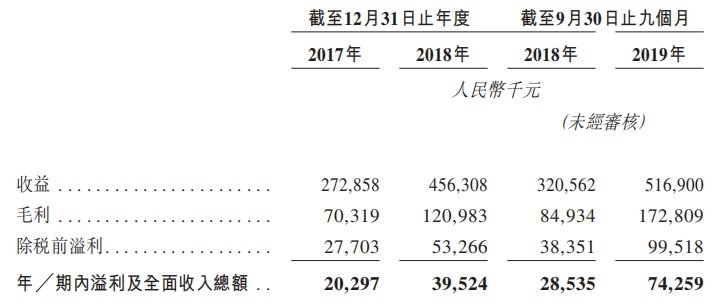 净利润由2017年的人民币2029.7万元增加94.6%至2018年的人民币3952.4万元,并由截至2018年9月30日止九个月的人民币2853.5万元大幅增加至2019年同期的人民币7425.9万元。