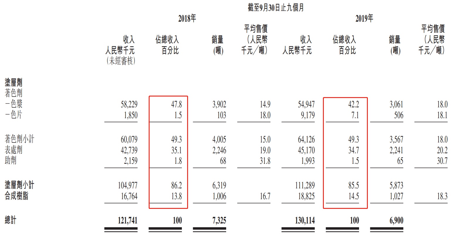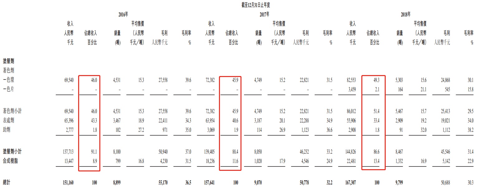公司的主要收益来自涂层剂,截至2016年、2017年及2018年12月31日止年度以及截至2019年9月30日止九个月,来自着色剂的收益分别占总收益的46%、45.9%、51.4%和49.3%;来自表面处理剂的收益分别占总收益的43.3%、40.6%、33.4%和34.7%。