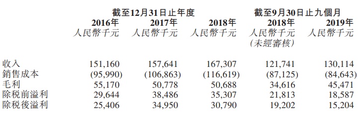 截至2016年、2017年及2018年12月31日止年度以及截至2019年9月30日止九个月,公司的收入分别约为人民币1.51亿元、人民币1.58亿元、人民币1.67亿元和人民币1.30亿元,及纯利分别约为人民币2540万元、人民币3495万元、人民币3079万元和人民币1520万元。
