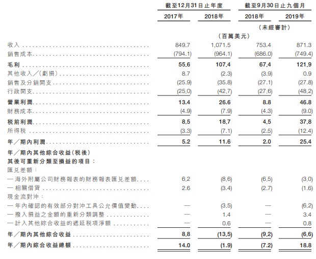 近年的收入及利润均实现大幅增长。截至2017年及2018年12月31日止年度,总收入分别为8.497亿美元及10.715亿美元,净利润分别为520万美元及1160万美元,增长率分别为26.1%及123.1%。