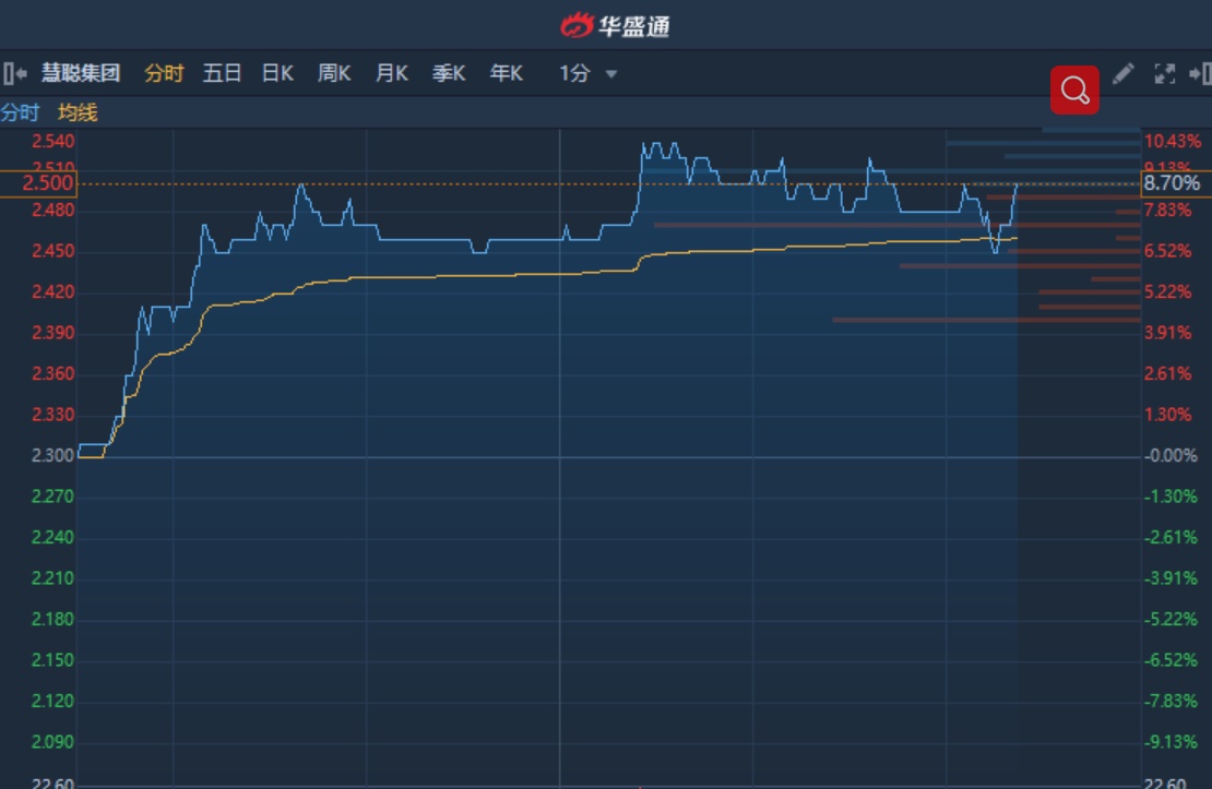 智通财经APP获悉,慧聪集团(02280)盘中大涨逾8%,突破多条均线。截至15时21分,涨8.7%,报价2.5港元,成交额688万。