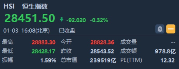 智通财经APP获悉,恒指早盘高开284.84点或1%,报28828.36点。截至收盘,恒生指数跌92.02点或0.32%,报28451.5点,全日成交额达978.87亿。国企指数跌0.59%,报11253.55点,红筹指数跌0.74%,报4545.19点。
