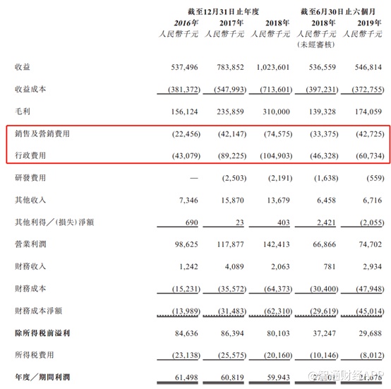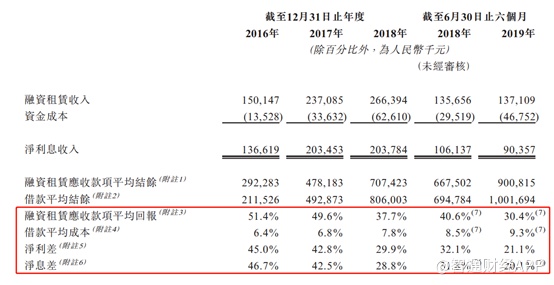 2019年的收入增速显著下滑,利润更是大幅下滑。实际上,2018年收入同比增速为30.6%,较之2017年46%的增速已经出现大幅滑坡,2019年只是更近一程。这也说明在车市行情不好时,汽车融资租赁的生意也不好做。在毛利率还算稳定的情况下,净利率分别为11.4%、7.8%、5.9%、4.0%,持续下滑,而这主要是因为期内销售及营销费用率,以及行政费用率不断提升,两项之和从2016年的月12%增加至2019年上半年的月19%,大幅压缩了利润空间,而这两项费用增加也可以从侧面说明同业竞争的激烈程度正在加剧。