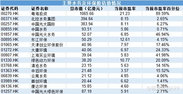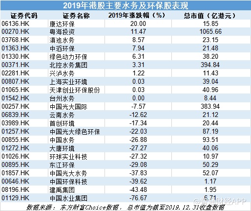 2019年,港股环保和水务板块整体跑输大盘。水务板块大部分个股录得下跌,仅粤海投资(00270)和康达环保(06136)年涨幅超过恒指,为数不多的主要环保股几乎“全军覆没”,无一跑赢恒指,这些股票的估值也均接近历史底部。