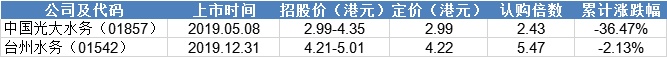 2019年,港股新添了两只水务股:中国光大水务(01857)和台州水务(01542)。市场对新上市的水务股不感冒,中国光大水务上市首日便破发,当日收跌11.37%,之后一路震荡走低,当前市值约为52.6亿港元。台州水务于2019年的最后一日上市,当日平收,目前股价在发行价以下,市值8.3亿港元。