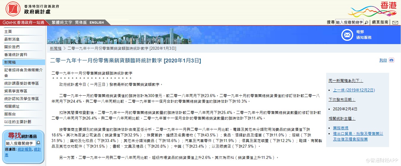 政府发言人表示,零售业销售在11月继续大幅下滑。发言人还表示,零售业的短期前景继续取决于香港未来发展。