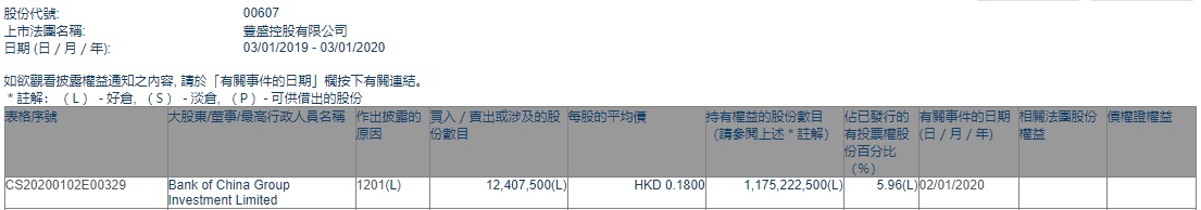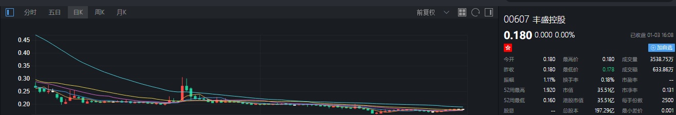 截止至1月3日收盘,丰盛控股无涨跌,每股报价0.18港元。