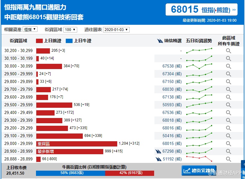 智通财经APP获悉,截至2020年1月4日,恒指最新的牛熊街货比例58:42。瑞信恒指牛熊证街货分布图中的数据显示,熊证街货重货区在29000-29099区间,该区间最新熊证数量为1204张,较上一交易日增加312张;最多新增熊证在28900-28999区间,新增415张。牛证街货重货区在27900-27906区间,该区间最新牛证数量为1299张,较上一交易日增加790张,最多新增也正在这一区间。