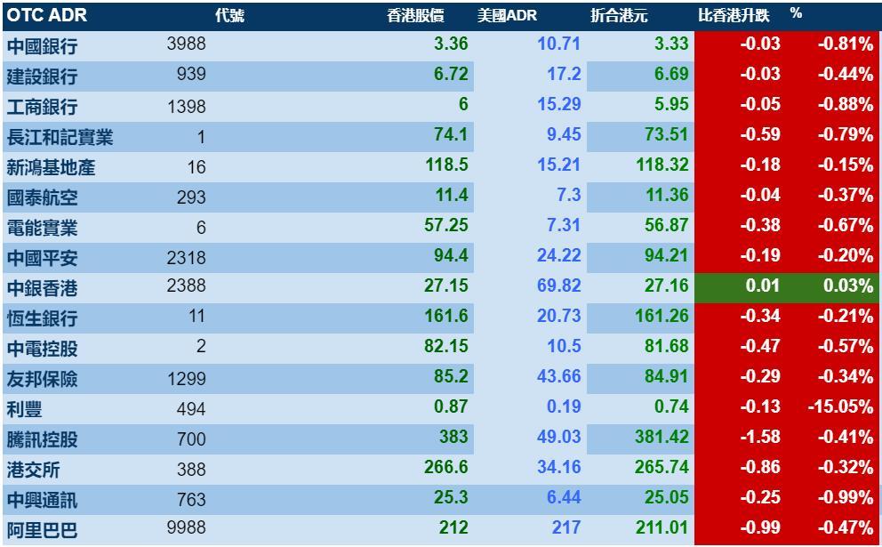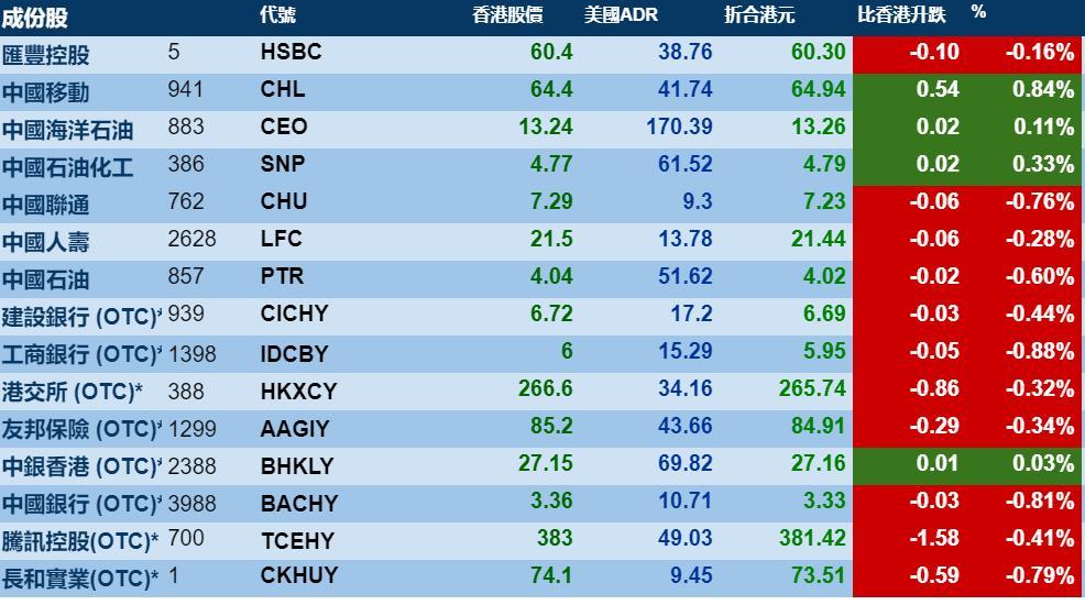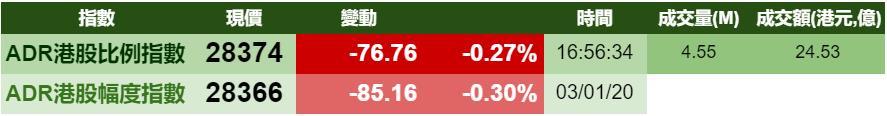 智通财经APP获悉,1月4日,美股受地缘政治影响下跌,港股ADR指数也毫无悬念下跌,按比例计算,收报28374点,跌76.76点或0.27%。汇丰控股收报60.30元,较港收市跌0.10元;腾讯控股收报381.42元,较港收市跌1.58元。