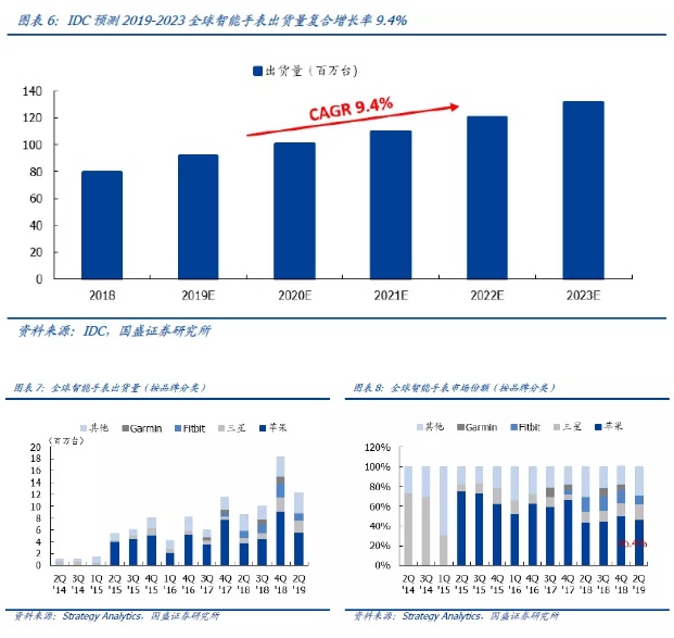 智能手表出货量快速增长,是可穿戴设备的主要产品之一。自2014年三星首次推出智能手表以来,智能手表的出货量迅速增加,2018年全球出货量达79.1百万台,相比2014年增长近80倍。根据市场调查机构IDC的预测,2019年智能手表市场全球出货量有望达到91.8百万台,若按照9.4%的年复合增长率来计算,2023年市场规模将增加至1.32亿台。随着Apple Watch以及来自其他电子产品制造商的各种智能手表越来越受欢迎,智能手表在整个可穿戴设备市场的份额将从去年的44%增长到2023年的47%。