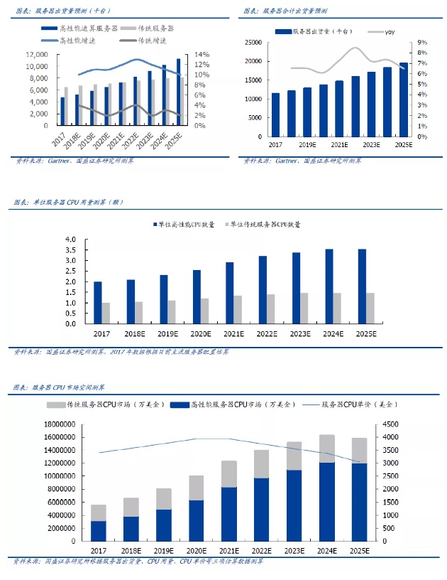 高性能服务器带动服务器市场加速成长。产业信息网数据显示,2017年传统服务器出货量达650万台,预计传统服务器出货量增速将延续往年趋势,在低个位数百分比水平波动,2025年出货量有望超8百万台。高性能服务器方面,2017年出货量达480万台,预计增速将始终保持在两位数水平,2022年出货量或将超越传统服务器,2025出货量有望达到1100万台。