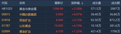 截至发稿,中国白银集团(00815)涨6.67%,报0.96港元;招金矿业(01818)涨5.12%,报9.44港元;山东黄金(01787)涨4.19%,报19.9港元;紫金矿业(02899)涨1.23%,报4.1港元。