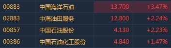 智通财经APP获悉,国际油价涨幅扩大,布油升破70美元/桶关口,港股石油板块涨势延续。截至9时34分,中海油(00883)涨3.47%,报价13.7港元,中石油(00857)涨2.23%,中石化(00386)涨1.47%。