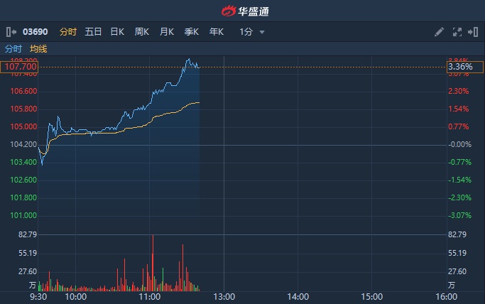 智通财经APP获悉,美团点评-W(03690)股价在高位震荡近一个月,今日重获资金追捧,盘中高见108.3港元,刷新上市以来新高。此外,美团近日获中金上调目标价22%至110港元,评级“优于大市”。截至发稿,涨3.36%,报107.7港元,成交额14.44亿港元。