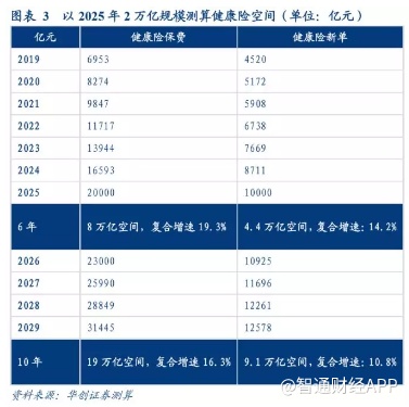 根据《意见》提出的力争到2025年,健康险市场规模超过2万亿元测算:未来6年健康险整体保费还有8万亿空间,复合增速在20%左右,累计新单保费4.4万亿空间,复合增速在15%左右;未来10年健康险整体保费还有19万亿空间,复合增速在15%左右,累计新单保费9.1万亿空间,复合增速在10%左右。