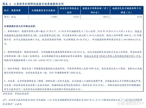考虑社会医保基金结余,以参保率和保障程度提升测算健康险空间,未来5年健康险渗透率达到50%,人均准备金余额6万元,年新单保费9909亿元。