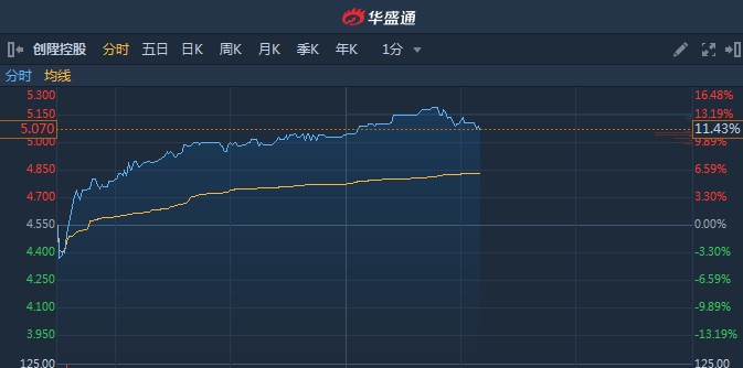 智通财经APP获悉,创陞控股(02680)延续升势,盘中曾飙涨逾13%,高见5.19港元,再度刷新历史新高。截至14时09分,涨11.43%,报价5.07港元,成交额6086万。