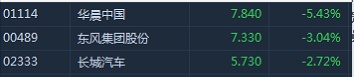 智通财经APP获悉,汽车股普跌,华晨中国(00489)午后跌幅扩大逾5%,跌破多条均线,暂领跌汽车板块。截至14时43分,华晨中国跌5.43%,报价7.84港元,东风集团(00489)跌3.04%,长城汽车(02333)跌2.72%。