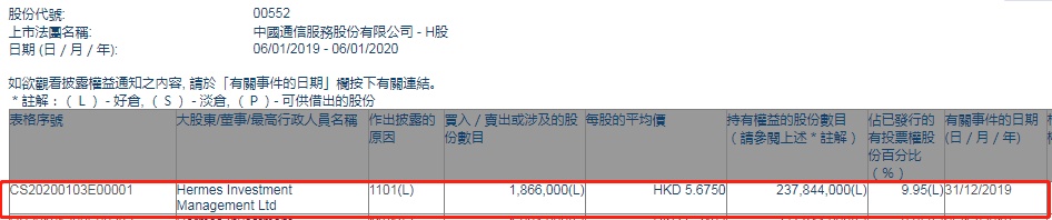 智通财经APP获悉,联交所最新资料显示,12月31日,Hermes Investment减持中国通信服务(00552)186.6万股,每股作价5.675港元,总金额约为1058.96万港元。减持后最新持股数目约为2.38亿股,最新持股比例为9.95%。