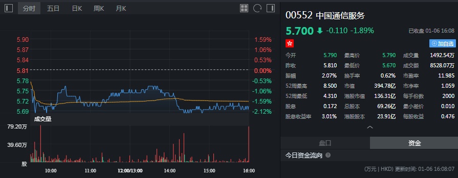 截止至今日收盘,中国通信服务跌1.89%,每股报价5.70港元。