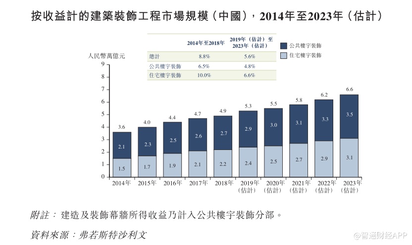 据智通财经APP了解,2014年至2018年,国内的建筑装修行业迎来了强劲增长,市场规模以8.8%的年复合增长率由3.6万亿增至4.9万亿元人民币(单位下同)。其中,公共楼宇装修作为国内的建筑装修行业的主要组成部分,市场规模快速扩展,由2.1万亿元增至2.7万亿元,年复合增长6.5%,住宅楼宇装修由1.5万亿元增至2.2万亿元,年复合增长10%;住宅楼宇装饰工程作为国内的建筑装修行业的另一个重要组成部分,规模也实现了快速的增长,由1.5万亿元增至2.2万亿元,年复合增长10%。