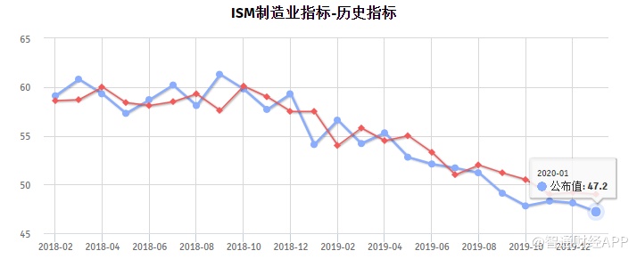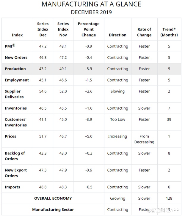 然而,上周五(1月3日)发布的美国12月ISM制造业PMI却仅为47.2,是自2009年6月以来最低水平,也远低于预期的49和前值的48.1。该数据已连续第五个月处于荣枯分水岭50下方,意味着美国制造业活动继续萎缩,同时可能还会拖累服务业的表现。
