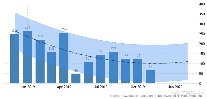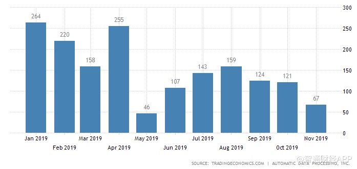 2019年12月4日数据显示,美国ADP就业人数11月增加6.7万人,创自6月以来最低位,且不及预期的增加13.5万人次,相比来看,10月份修正后ADP就业人数为增加12.1万人,环比下降约45%。