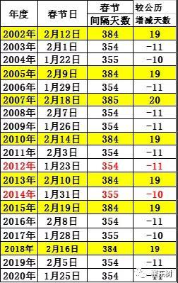 农历平年有十二个月,全年354天或355天,闰年为十三个月,闰年全年383天或384天。因此形成2002年、2005年、2007年、2010年、2013年、2015年和2018年是春节距上一年天数多的。