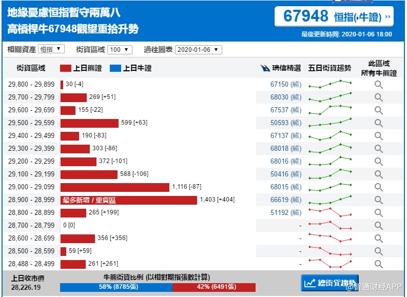 智通财经APP获悉,截至2020年1月7日,恒指最新的牛熊街货比例58:42。瑞信恒指牛熊证街货分布图中的数据显示,熊证街货重货区在28900-28999区间,该区间最新熊证数量为1403张,较上一交易日增加404张;最多新增熊证亦在此区间。牛证街货重货区在27900-27999区间,该区间最新牛证数量为850张,较上一交易日减少379张,最多新增区间为27500-27599,新增张数为195。