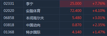 智通财经APP获悉,体育用品股重获市场追捧,相关个股集体放量上扬,截至10时14分,李宁(02331)涨7.76%,报价25港元,安踏(02020)涨4.1%,本间高尔夫(06858)涨3.01%,特步(01368)涨1.47%。