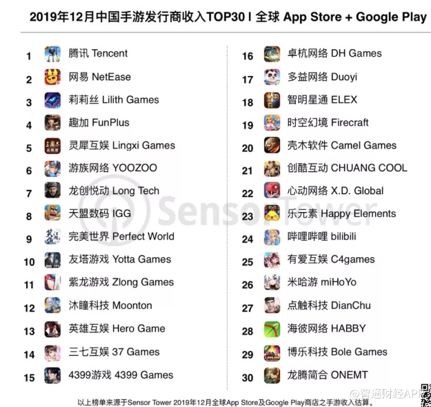 Sensor Tower 商店情报平台显示,2019年12月中国手游发行商在全球 App Store 和 Google Play 的收入排名。榜单中30个手游发行商12月全球吸金超过14.9亿美元,占当期全球手游总收入26.9%。