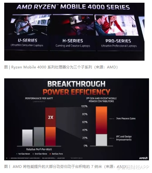 随后,第三代 Ryzen Mobile 4000 系列处理器终于亮相。AMD 称这是世界上第一款使用 7 纳米工艺的笔记本电脑处理器,第一批合作厂商包括宏碁,华硕,戴尔(DELL.US),联想(00992)和惠普(HPQ.US),预计在今年第一季度就能看到 OEM 电脑。